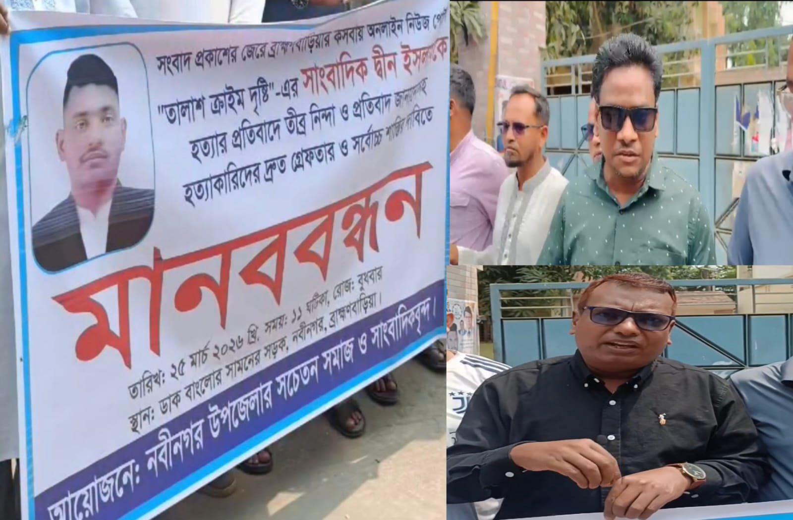 ব্রাহ্মণবাড়িয়ার নবীনগর সদরে জেলা পরিষদ ডাক বাংলোর সামনে কসবার অনলাইন নিউজ পোর্টাল “তালাশ ক্রাইম দৃষ্টি ” -এর সাংবাদিক দ্বীন ইসলামকে সংবাদ প্রকাশের জেরে হত্যার প্রতিবাদে তীব্র নিন্দা ও হত্যাকারিদের গ্রেফতার করে সর্বোচ্চ শাস্তির দাবিতে নবীনগর উপজেলায় মানববন্ধন অনুষ্ঠিত হয়েছে।
