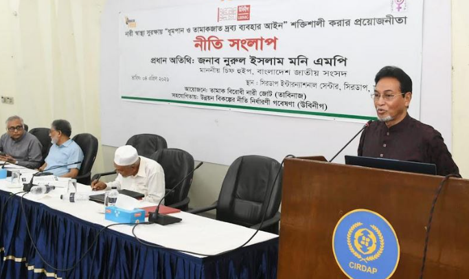 আজ শনিবার রাজধানীর সিরডাপ মিলনায়তনে নারী স্বাস্থ্য সুরক্ষায় ‘ধুমপান ও তামাকজাত দ্রব্য ব্যবহার আইন’ শক্তিশালী করার প্রয়োজনীয়তা শীর্ষক নীতি সংলাপ অনুষ্ঠানে প্রধান অতিথির বক্তব্যে চীফ হুইপ এসব কথা বলেন।