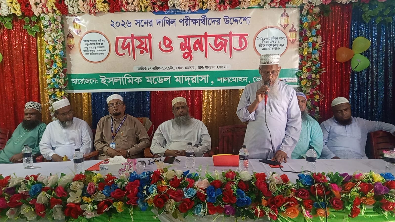 ভোলার লালমোহনে ইসলামিক মডেল মাদরাসার দাখিল পরীক্ষার্থীদের জন্য দোয়া মুনাজাতের অনুষ্ঠান করা হয়েছে। প্রতিষ্ঠানের পরিচালক অধ্যাপক এম এ জাহের এতে সভাপতিত্ব করেন। ১৭ এপ্রিল জুমাবার সকালে মাদরাসার হলরূমে এই অনুষ্ঠানের আয়োজন করা হয়। প্রধান অতিথি হিসেবে উপস্থিত ছিলেন জামায়াতে ইসলামীর উপজেলা আমীর মুহাদ্দিস আব্দুল হক। বিশেষ অতিথি হিসেবে বক্তব্য দেন লালমোহন ইসলামিয়া কামিল মাদরাসার অধ্যক্ষ মাওলানা মোশাররফ হোসেন, ইসলামী সমাজ কল্যাণ পরিষদের সহকারী সেক্রেটারি মাওলানা আব্দুল মালেক, উপাধ্যক্ষ নিয়াজ মাহমুদ, মুহাদ্দিস মাওলানা নাজমুল হক, অধ্যক্ষ মাওলানা সফিউল্লাহ, কিন্চেডারগার্টেন এসোসিয়েশনের কেন্দ্রীয় নির্বাহী কমিটির পরিকল্পনা বিষয়ক সম্পাদক আবুল খায়ের, চেয়ারম্যান আবুল বাশার সেলিম, অভিভাবকের পক্ষ থেকে সহকারী প্রধান শিক্ষক মাওলানা সিদ্দিকুল্লাহ, শিক্ষক প্রতিনিধি মাওলানা লোকমান হোসাইন, আজিম উদ্দিন খান, ফয়জুল আলম সুমন প্রমুখ। অধ্যাপক আবু তাইয়্যেবের উপস্থাপনায় অনুষ্ঠানে অধ্যয়নরতদের থেকে বক্তব্য দেন লালমোহন মডেল একাডেমীর নবম শ্রেণীর ছাত্রী সামিয়া রায়হান সায়মা, পরীক্ষার্থীদের থেকে মানপত্র পাঠ করেন ছালমা আক্তার ও বক্তব্য রাখেন মুহিত আহসান। মুনাজাত পরিচালনা করেন প্রতিষ্ঠানের সাবেক পরিচালক মাওলানা আব্দুল হক। উল্লেখ্য যে এবছর এই মাদরাসা থেকে প্রথমবারের মতো ২৩ জন শিক্ষার্থী আসন্ন দাখিল পরীক্ষায় অংশগ্রহণ করবেন।