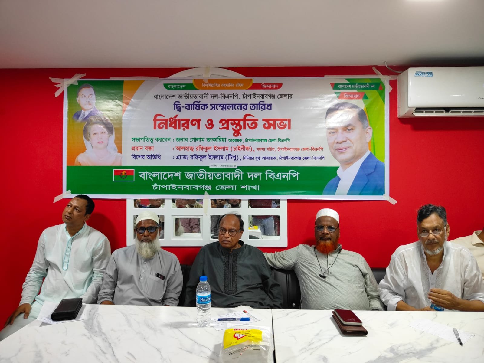 চাঁপাইনবাবগঞ্জে বাংলাদেশ জাতীয়তাবাদী দল (বিএনপি) এর জেলা শাখার দ্বি-বার্ষিক সম্মেলনকে সামনে রেখে তারিখ নির্ধারণ ও প্রস্তুতি সভা অনুষ্ঠিত হয়েছে। শনিবার (২৫ এপ্রিল) বিকাল ৫টায় শহরের একটি হোটেলে জেলা বিএনপির উদ্যোগে এ সভা আয়োজন করা হয়। এতে সভাপতিত্ব করেন জেলা বিএনপির আহ্বায়ক গোলাম জাকারিয়া।